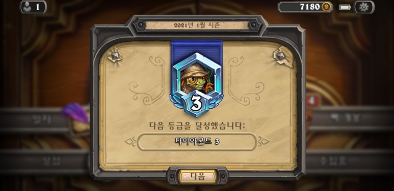 마지막 새해 퀘스트로 정규 등급전 5회 완료가 있어서 정규전을 더 돌렸더니 다이아 3급을 찍었습니다.