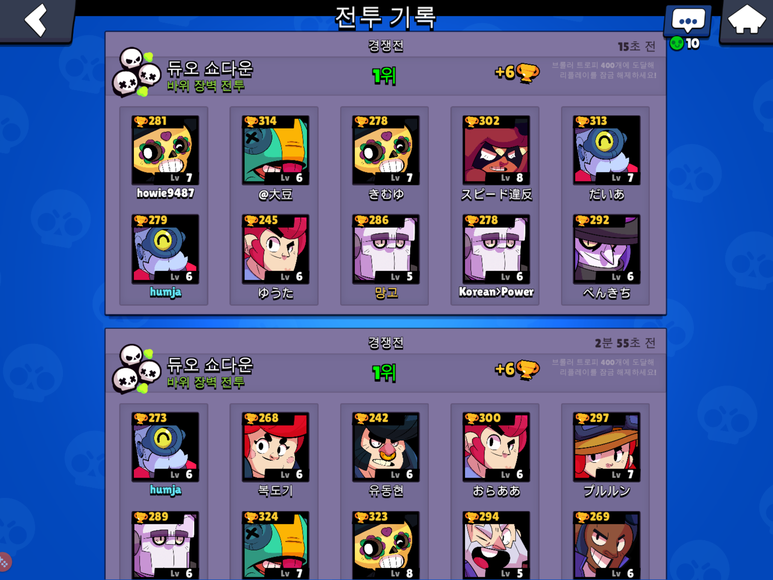 브롤스타즈 - 바위 장벽 전투 듀오 쇼다운 발리 플레이 전적