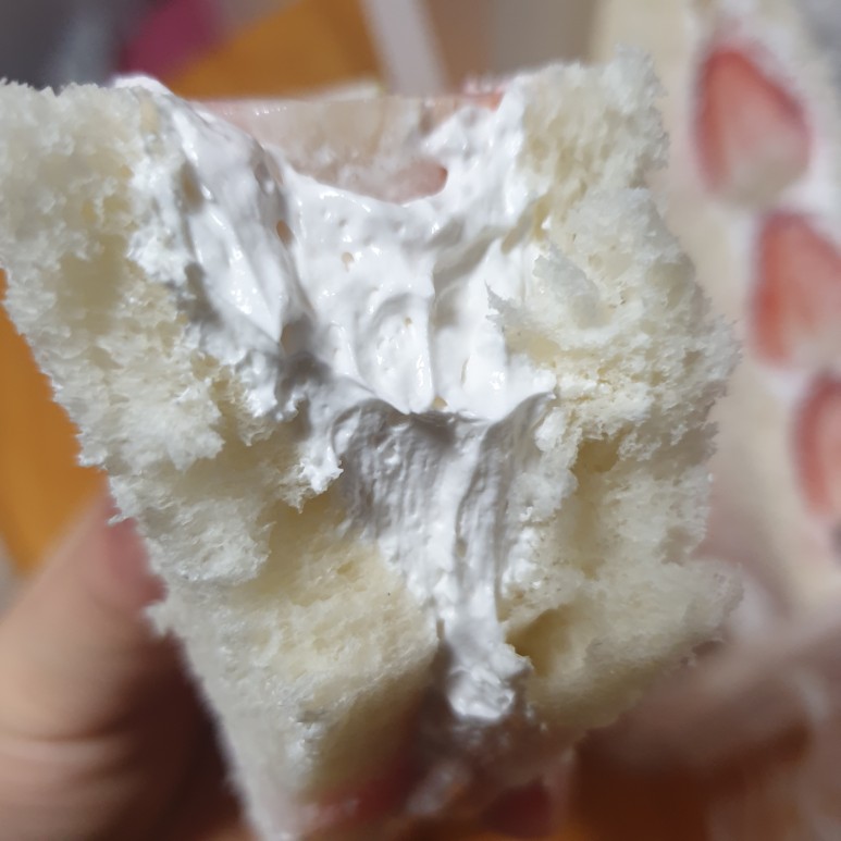 딸기크림을 사용한 GS의 제품과는 달리 CU의 딸기 샌드위치는 서울우유와 제휴를 해서인지 우유크림을 사용해서 좀 더 부드러운 맛을 추구한 모습입니다.