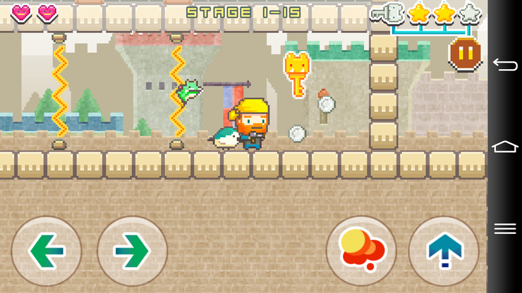매 스테이지마다 적을 물리치고 장애물을 피하면서 별과 열쇠를 모아야 합니다.