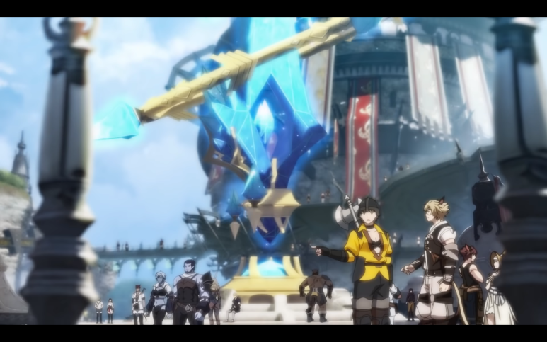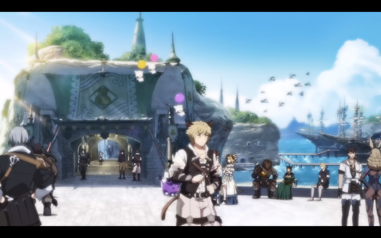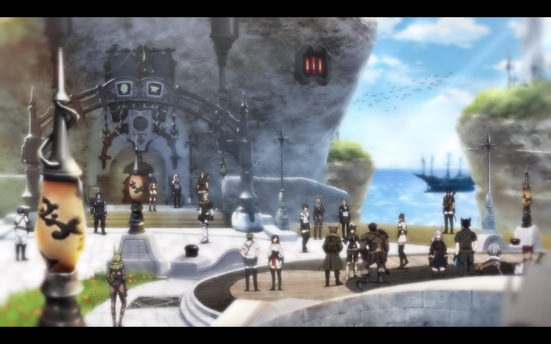 시원한 바다를 배경으로 한 도시 국가인 림사 로민사는 게임 내적으로도 사람들이 가장 많이 모이는 지역인데요, 애니메이션에서는 많은 사람들이 북적이는 모습을 통해 그 특징을 잘 전달하고 있습니다.