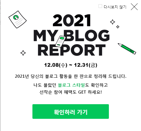 네이버에서 '2021 MY BLOG REPORT'라고 2021년 한 해 동안 블로그를 운영한 사람들의 활동 내역을 정리해 주고 있습니다.