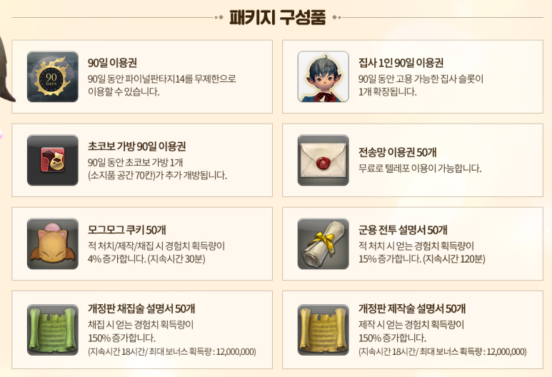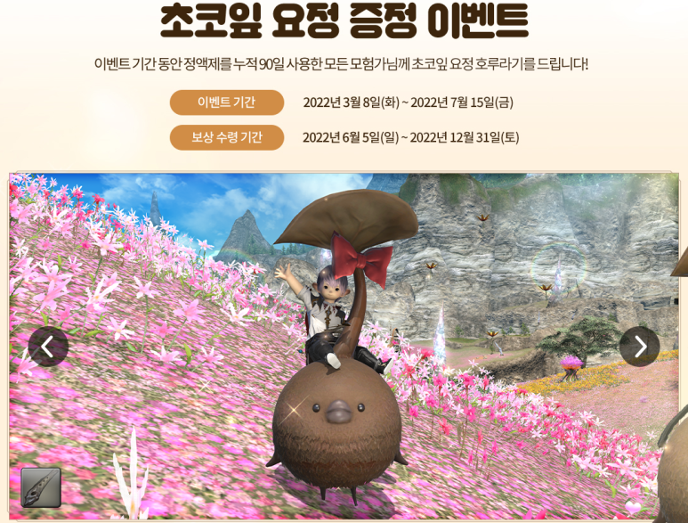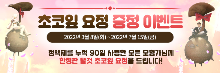 3월 8일부터는 효월의 종언 정액제 사전예약 90일 이용권 패키지 판매 및 초코잎 요정 증정 이벤트를 진행하고 있는데요, 90일 이용권을 비롯하여 육성에 도움이 되는 각종 아이템들을 저렴한 가격으로 판매하고 있습니다. 더불어 이벤트 기간 내에 정액제 누적 90일을 사용한다면, 한정판 탈것인 초코잎 요정까지 획득할 수 있는 등 효월의 종언을 준비하는 데 있어 많은 도움이 될 것입니다.