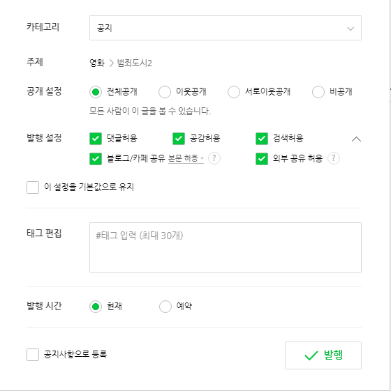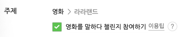 바로 글 카테고리를 이벤트 전용 카테고리로 설정 & 글감에서 리뷰할 영화 설정 & 글 주제를 영화로 설정하면 글 보내기 기능이 활성화되는 것이었습니다!
