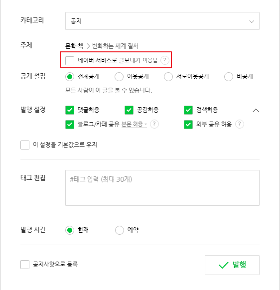 저렇게 '네이버 서비스로 글보내기'라는 항목이 활성화되어야 하는데, 이번 건 그냥 이벤트성으로만 잠시 열어둔 것 같습니다.