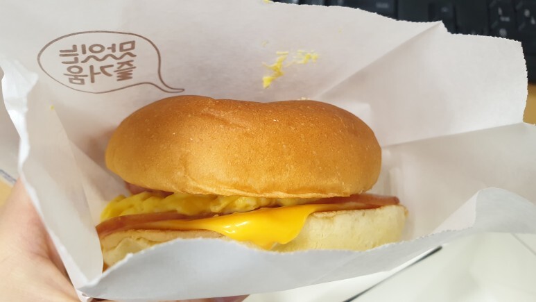 '베이컨 햄 에그 번'과 '에그 샐러드 번' 이렇게 두 가지가 있는데, 전 일단 베이컨 들어간 걸로 주문했습니다.