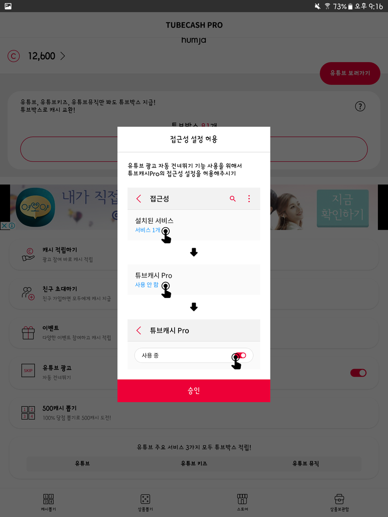 한 가지 팁을 드리자면, 앱이 먹통이 되는 경우에는 괜히 애먹지 말고 앱 지우고 새로 설치하세요. 다시 설치해도 이전에 가입했던 아이디로 접속하면 기존에 적립해 뒀던 캐시가 그대로 남아 있으니 걱정하실 필요 없습니다.
