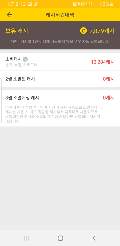 참고로 1캐시=1원이 아니라, 1캐시가 안드로이드 기준으로 약 0.77원 정도 한다는 것 알아두세요. 아이폰의 경우에는 1캐시의 가치가 안드로이드보다 더 낮다고 하는데, 제가 아이폰 유저가 아니라서 아이폰에서는 1캐시가 정확히 어느 정도의 가치인지는 모르겠네요.