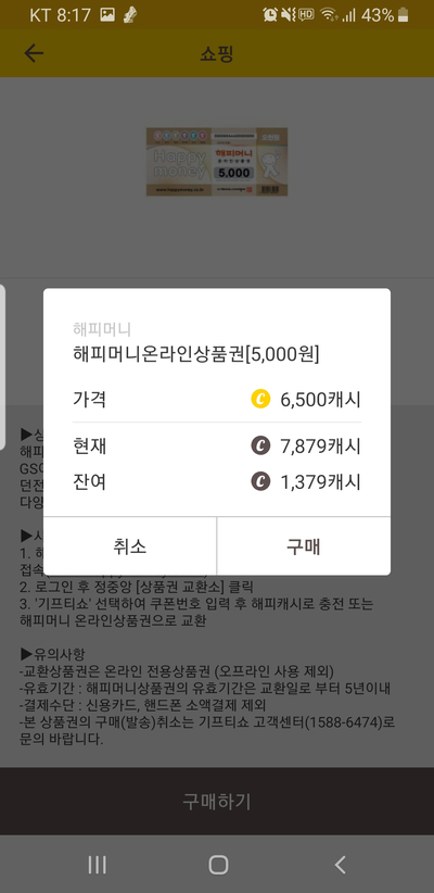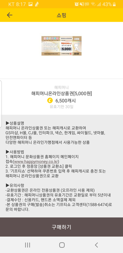 이렇게 5000원짜리 상품권을 6500캐시로 구매하면,
