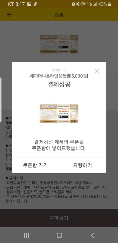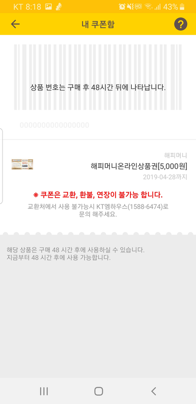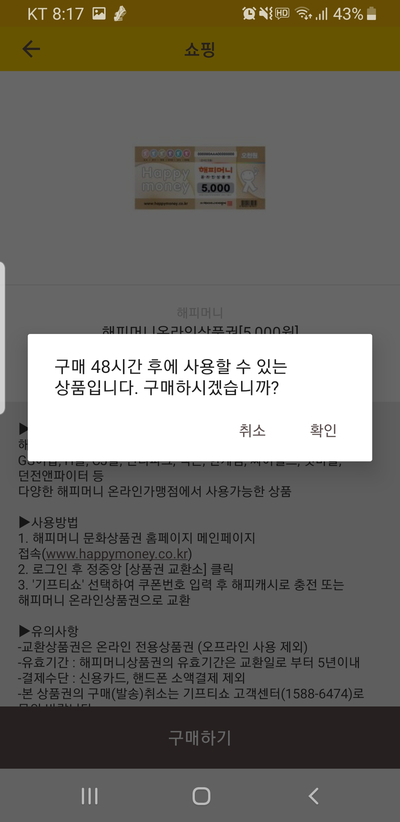 이렇게 구매한 상품권들은 종류에 상관없이 구매 48시간 후부터 사용이 가능하니, 사용할 거면 이틀 전에 미리 구입해놔야 합니다.