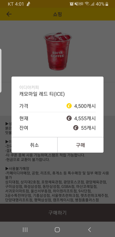 원래는 모아둔 캐시로 상품권을 구입하고 앱을 삭제하려고 캐시를 모으고 있었는데, 상품권 항목이 쇼핑 코너에서 사라져 있네요. 그래서 마지막으로는 이디야 캐모마일 레드 티를 구매하고 캐시워크는 지웠습니다. 정이 들어서인지 아쉽기는 하지만, 한편으로는 후련하기도 하네요.