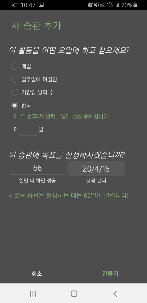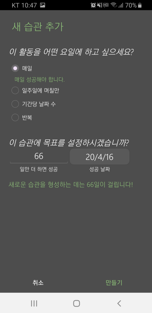 습관 이름을 설정한 후에는 습관을 어느 정도로 자주 달성할지 그 목표치를 정할 수 있습니다.