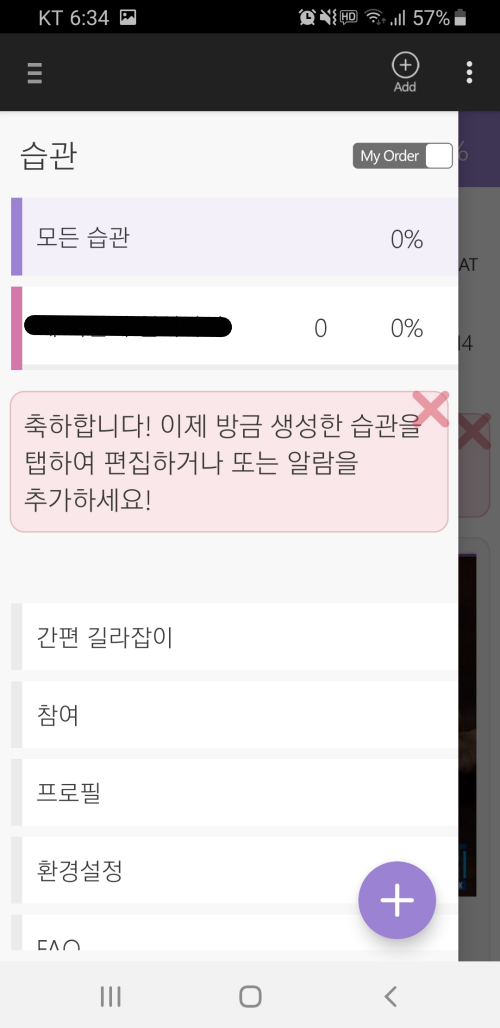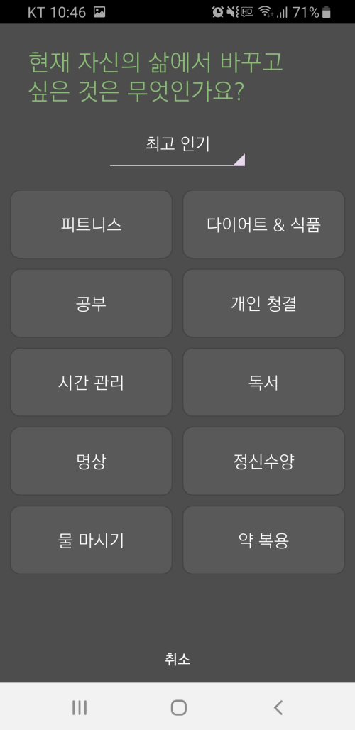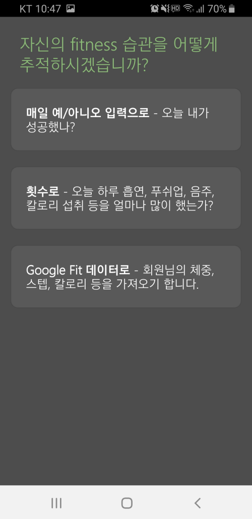 물론 습관 관리 기능을 이용하기 위해서는 먼저 목표를 설정해야 합니다. 습관이란 건 쉽게 고치기 어렵기 때문에 처음에는 아주 쉬운 목표부터 설정해서 차근차근 달성하면서 점점 어려운 목표를 설정하는 것을 추천합니다.