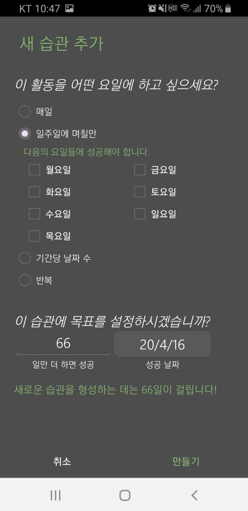 매일은 물론 일주일 중에서 특정 요일만 선택해 습관을 만들 수도 있고