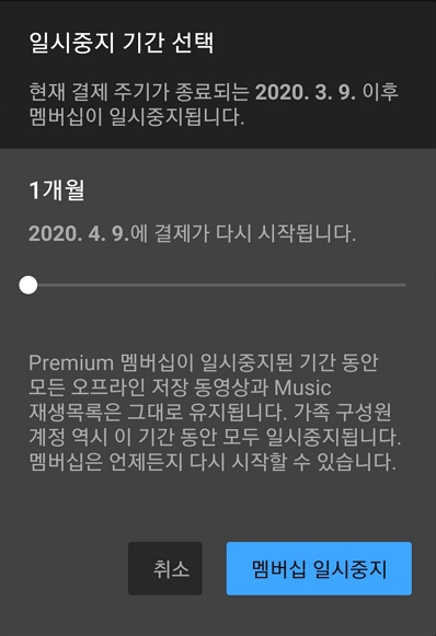 무시하고 멤버십을 취소하면 결제를 한 그 주기 동안은 유튜브 프리미엄 혜택을 계속 사용할 수 있습니다. 비활성화하는 시점에 바로 프리미엄 기능 사용이 불가능한 것이 아니고 원하는 시점에 언제든지 취소가 가능하다는 건데, 그렇다면 누가 일시 중지 기능을 사용할지 의문이네요. 그냥 취소했다가 다시 끌리면 그때 결제하면 되잖아요?