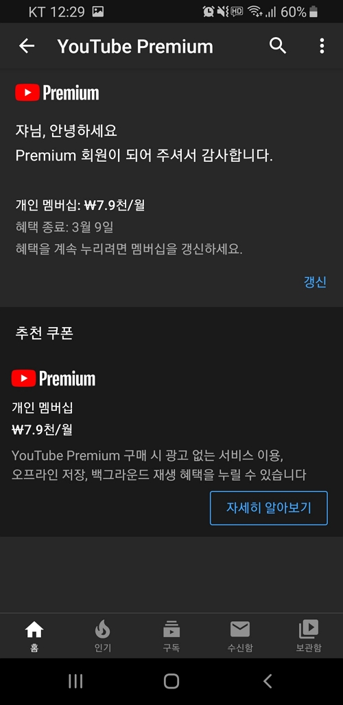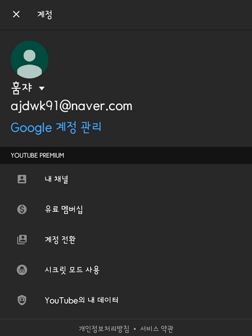 하여튼 유튜브 프리미엄을 사용하게 되면 내 계정 항목에서 'YOUTUBE PREMIUM'을 사용 중이라는 것을 알 수 있게 됩니다.