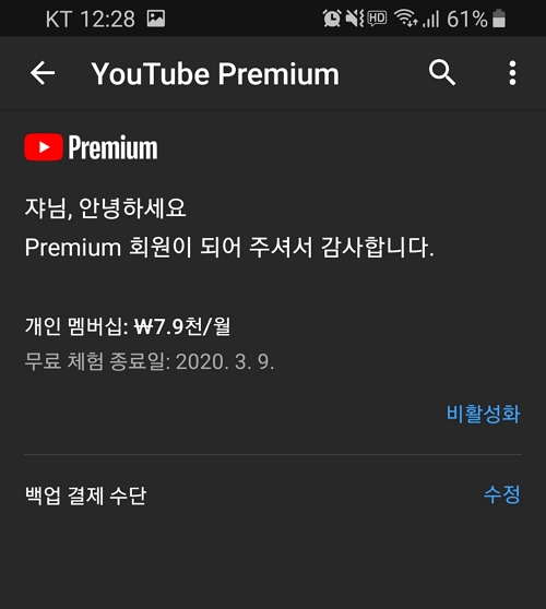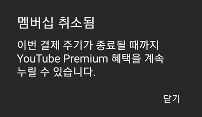 이렇게 자동 결제되기 전에 취소했습니다. 미리 취소하는 걸 잊어버리지 않을까 했는데, 유튜브를 이용하면서 항상 이걸 생각하고 있다 보니까 잊어버리지는 않았네요.