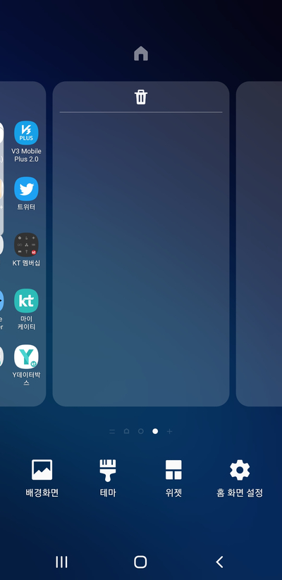 스마트폰 홈 화면을 밑에서 끌어올려서 '앱스 화면'으로 들어가서, 우상단의 점 세 개 아이콘을 클릭한 후에 뜨는 옵션 중에서 '홈 화면 설정'을 선택합니다.