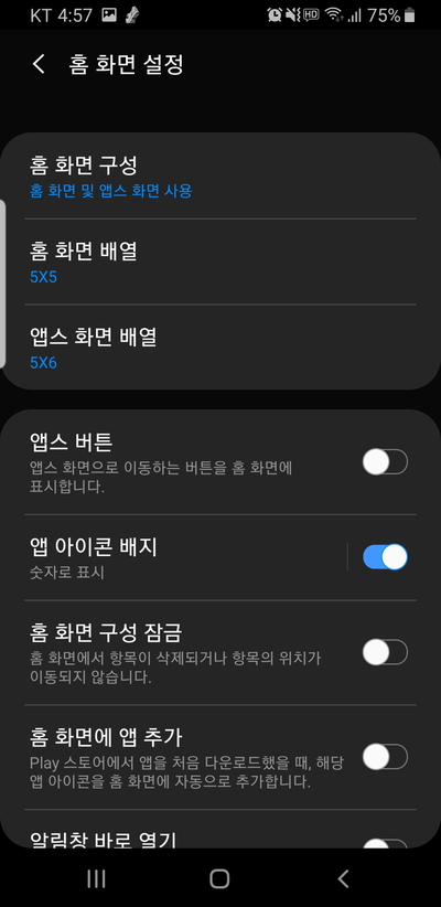나머지 하나로는 '메인 설정 -> 디스플레이 -> 홈 화면'의 경로를 따라가는 방법이 있습니다.