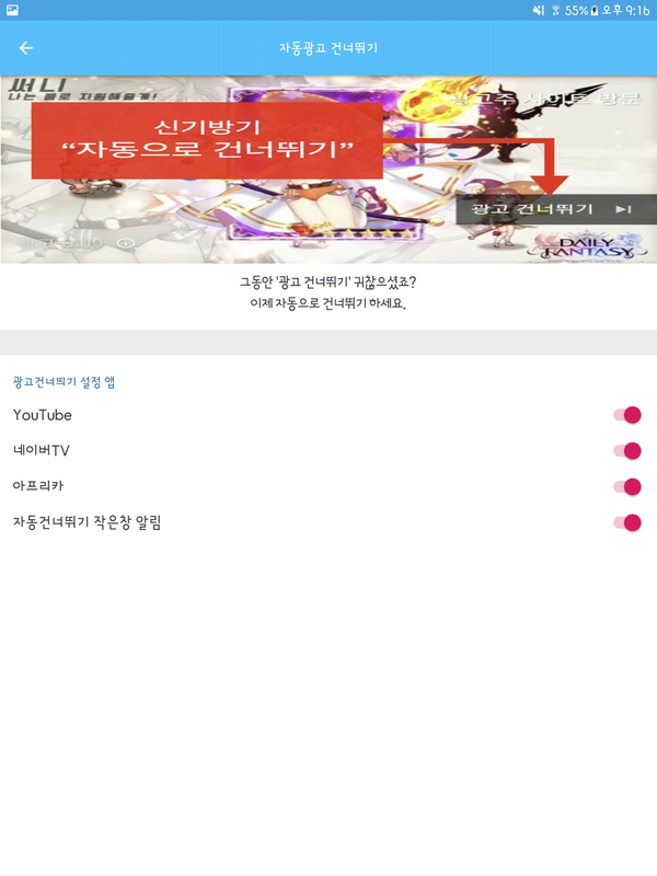 전반적으로 튜브캐시가 캐시튜브보다 사용 가능한 상품 종류도 적고, 캐시 적립 방법도 제한되어 있기는 하지만, 튜브캐시는 캐시튜브와는 다른 독특한 기능을 한 가지 가지고 있습니다. 바로 자동 광고 건너뛰기 기능입니다. 유튜브 등의 동영상을 시청하고 있을 때 나오는 광고를 직접 터치할 필요 없이 자동으로 건너뛰기 시켜주는 기능이죠.