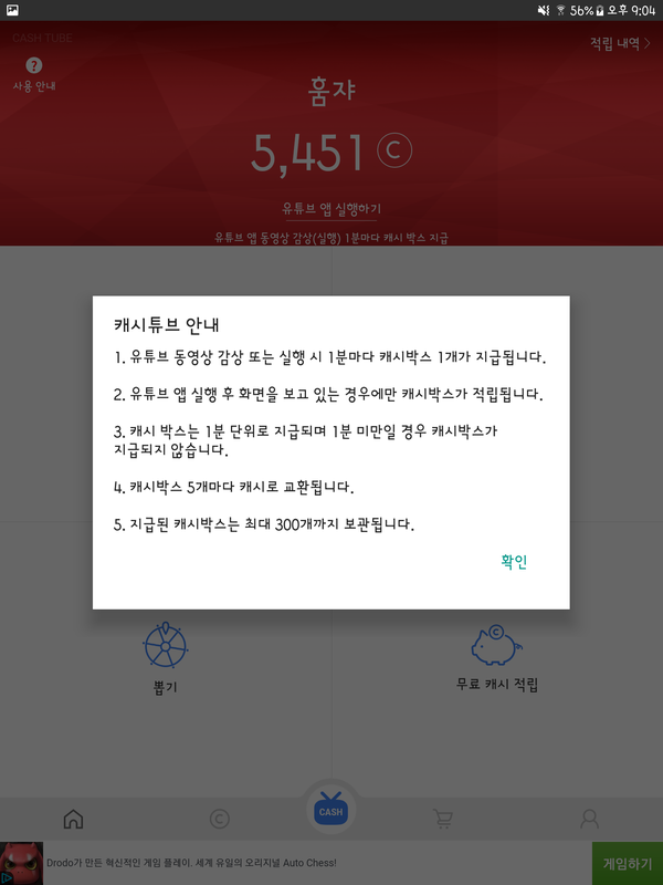이젠 동영상만 봐도 캐시가 적립된다! 캐시튜브를 설치하고 유튜브 앱 실행 후 동영상을 감상하세요. 다른 돈버는어플처럼 캐시 및 포인트를 리워드 받기 위해 계속 광고에 참여하는 것은 이제 그만하세요! 캐시튜브는 유튜브 동영상을 보기만 해도 캐시가 적립됩니다! 적립하신 캐시는 스토어를 통해 다양한 상품을 구매하시거나 현금으로 출금 받아가세요. * 편리한 서비스 이용을 위해 아래의 접근권한을 필요로 합니다. -필수 권한 전화 : 고유 아이디, 네트워크 상태 확