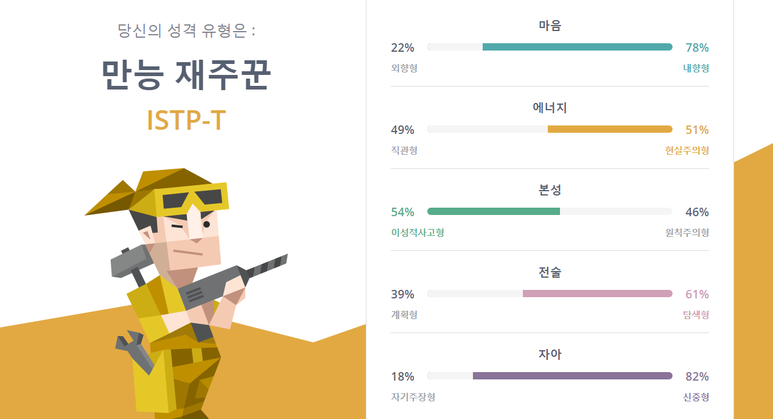 제 성격유형은 ISTP-T이군요. 전에 검사했을 때는 INTP였던 것 같은데, 성격이 변한 걸까요?